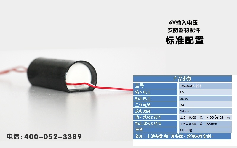 安防器材高压包 高压发生器广泛应用于静电吸附、安防器材、电子仪器、婚庆设备、灭蚊器、电子打火机、科学实验等等。我司自1991年开始研制开发安防类高压发生器,先后为电警棍、监狱高压电网、行侦探测仪、防盗提款箱等设备提供高质量的产品。
